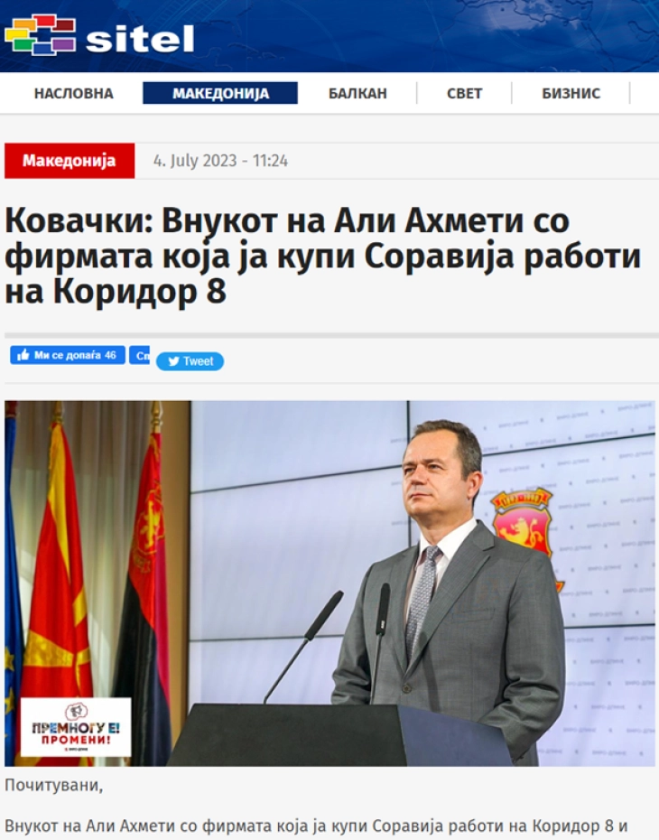 Во врска со видео-изјавата на членот на Извршниот Комитет на ВМРО-ДПМНЕ и пратеник Драган Ковачки, објавена на Јутуб каналот на ВМРО-ДПМНЕ, како и на интернет страницата на Сител Телевизија, со наслов „Ковачки: Внукот на Али Ахмети со фирмата која ја купи Соравија работи на Коридор 8“, сакаме да ве информираме дека се работи за комплетна невистина и погрешна пласирана информација …