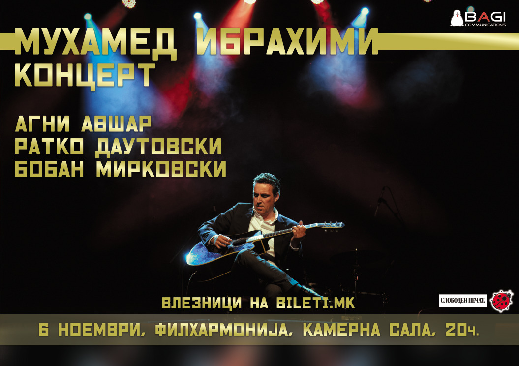 На 6 ноември, во камерната сала на Филхармонија, гитарскиот вуртуоз Мухамед Ибрахими ќе одржи свој концерт. Мухамед Ибрахими е скромен, но маестрален на сцена. Го нарекуваат скриен гитарски бисер, а за секој негов концерт секогаш се бара место повеќе. Тој својата гитара (мандолина, саз итн.) ја третира на многу неконвенционален начин, доста интуитивен и инспиративен. Неговите композиции се автентична мешавина …