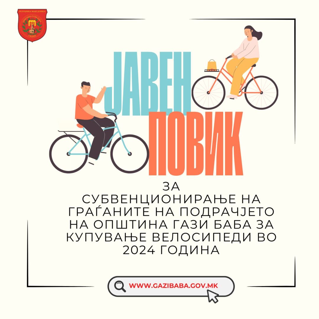 Општина Гази Баба објави Јавен повик за субвенционирање на граѓаните за купување на нов велосипед. За јавниот повик со објава на својата официјална страна на фејсбук, информираше и градоначалникот Бобан Стефковски. „Ве информирам дека е објавен јавниот повик за субвенционирање на граѓаните на општина Гази Баба за купување на нов велосипед! Право на учество на Јавниот повик имаат жителите на …