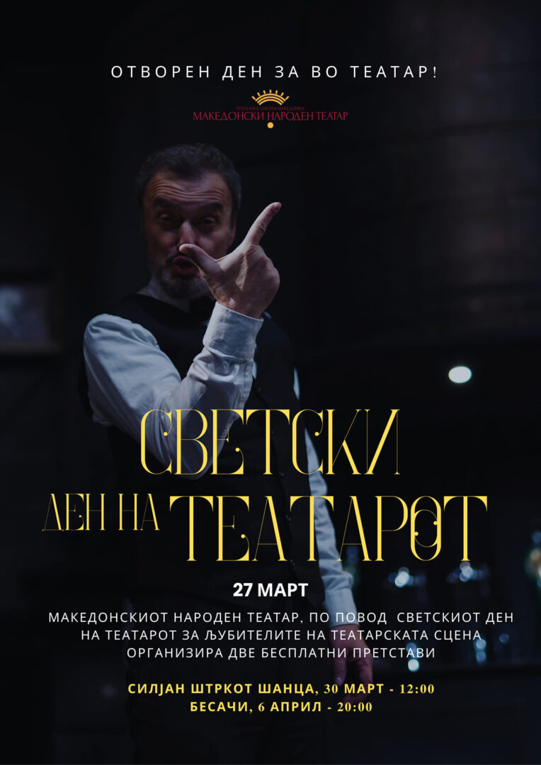 Македонскиот народен театар, по повод 27 Март, Светскиот ден на театарот, за љубителите на театарската сцена организира две бесплатни претстави. Станува збор за детско-младинската претстава „Силјан Штркот шанца“ во режија на Срѓан Јаниќијевиќ, која ќе се одигра на малата сцена на 30 март во 12 часот, и изведбата на претставата „Бесачи“, во режија на Јавор Грдев, која ќе биде со …