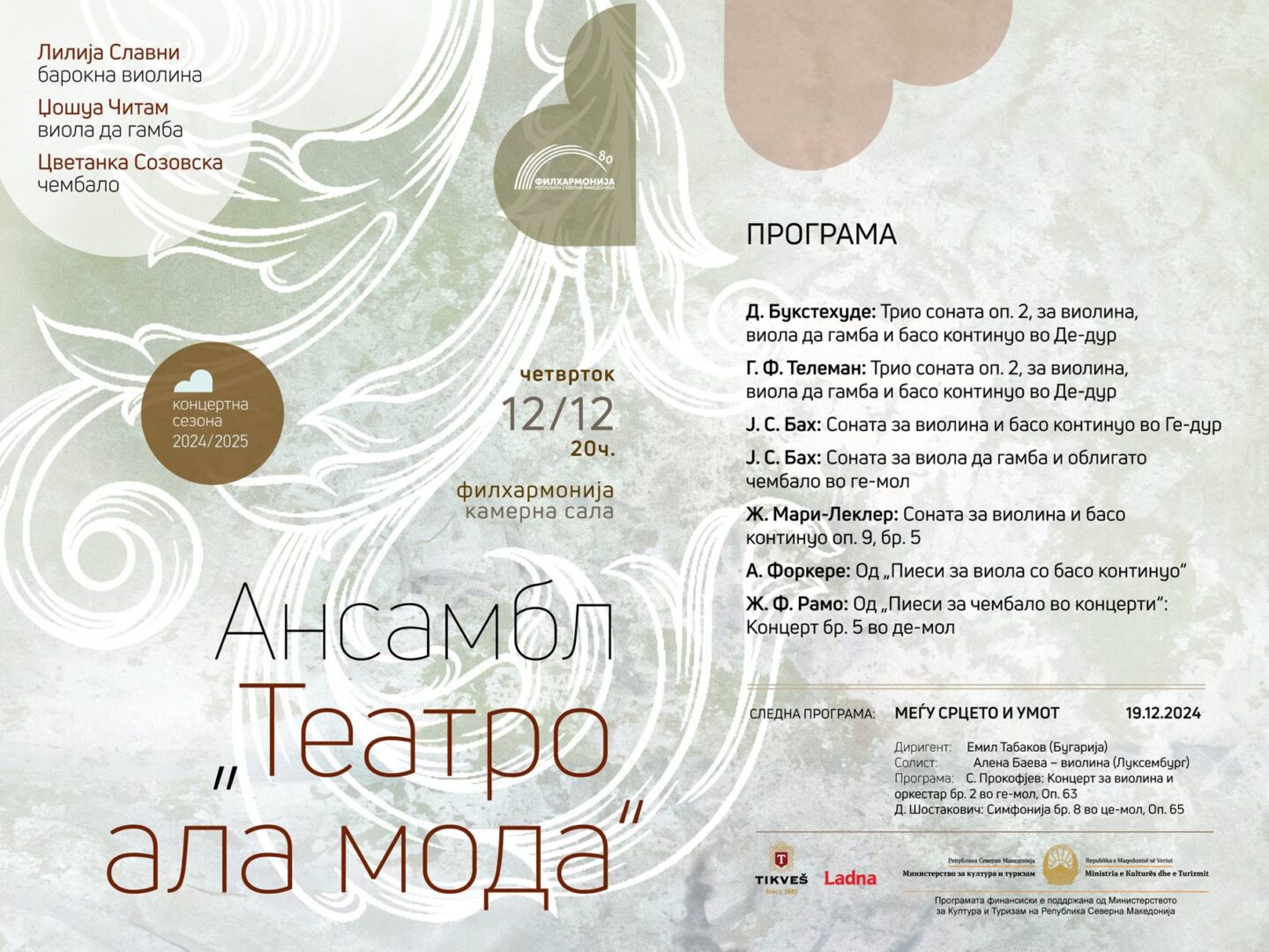 Ансамблот „Театро ала мода“ составен од музичари кои живеат и работат во Холандија, в четврток со почеток во 20 часот ќе настапат во Камерната сала на Филхармонија. Во ансамблот свири македонската чембалистка Цветанка Созовска, Лилија Славни (барокна виолина) и Џошуа Читам (виола да гамба). На програмата се дела Букстехуде, Телеман, Ј. С. Бах, Ж. Мари-Леклер, Форкере и Рамо. Преземајќи го …