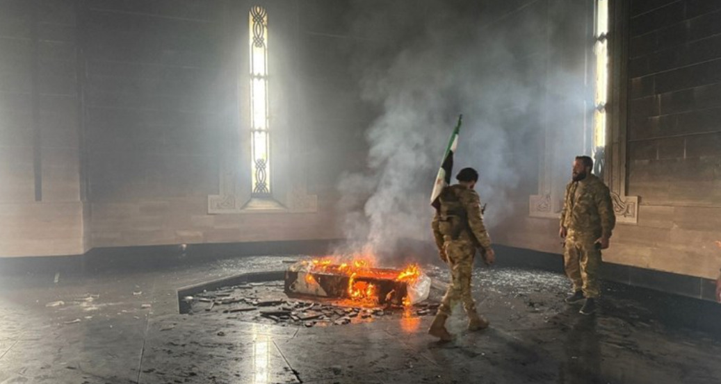 На социјалните мрежи се шират снимки и фотографии на кои се гледаат бунтовнички борци како стојат до запалениот гроб на починатиот сириски претседател Хафез ал Асад. Бунтовниците го извлекле ковчегот и го запалиле. АФП пренесува дека бунтовниците во униформи, како и локални жители, гледале како ковчегот гори. Syrian rebels destroyed the crypt and tomb of dictator Hafez al-Assad, Bashar’s father. …