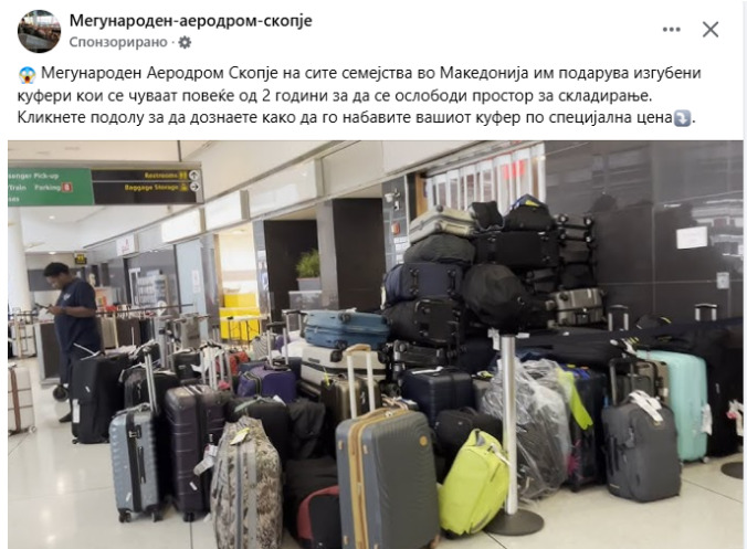 ТАВ Македонија, подружница на ТАВ Аеродроми ја информира и ја предупреди јавноста дека има лажни страници и профили на социјалните мрежи, на кои наводно се продава изгубен багаж на Меѓународниот аеродром Скопје. „Ова се лажни објави на социјалните мрежи преку кои се шират лажни информации за наводна продажба на изгубен багаж во име на Меѓународниот Aеродром Скопје, односно аеродромскиот оператор ТАВ Македонија, а понатаму, корисниците се пренасочуваат …