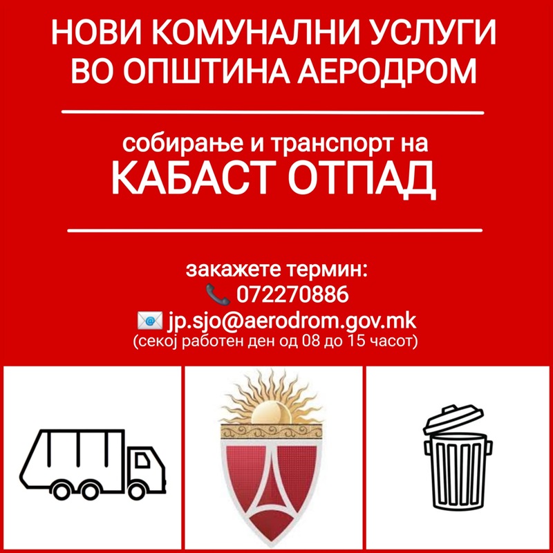 Жителите на Општина Аеродром отсега имаат можност да уживаат во нови, модерни и достапни комунални услуги, што ги воведува Јавното претпријатие за комунални дејности на општината. Со ова, Аеродром станува првата општина во Град Скопје што нуди ваков вид услуга. Новите комунални услуги опфаќаат: Транспорт на градежен шут (пакуван во вреќи), кабаст, растителен и комунален отпад од домаќинства, комерцијални …