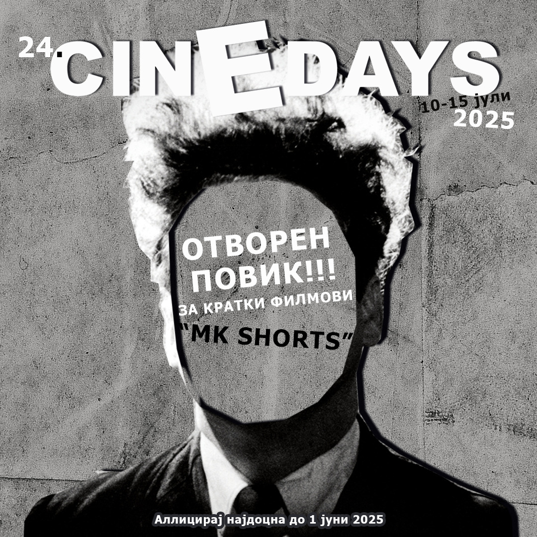 Фестивалот на eвропски филм „Синедејс“, распишува конкурс за пријавување на кратки филмови кои ќе бидат прикажани во рамки на „MK Shorts“ програмата на 24. издание што ќе се одржи од 10 до 15 јули, 2025. Пријавените филмови треба да се со времетраење до 20 минути, со година на продукција 2023/2024. Истите, може да се во формат на анимиран или игран …
