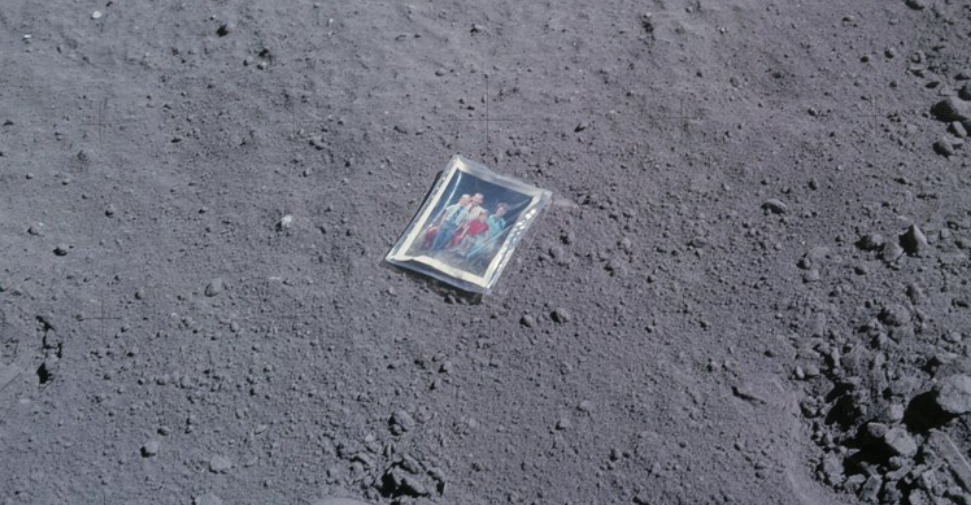 Астронаутот Чарлс Дјук, член на мисијата Аполо 16, оставил семејна фотографија на Месечината за време на неговата мисија во 1972 година. На сликата се тој, неговата сопруга Дороти и нивните два сина, Чарлс Дјук III и Томас Дјук. На задната страна на фотографијата пишува: „Ова е семејството на астронаутот Дјук од планетата Земја. Слета на Месечината во април 1972 година“. …