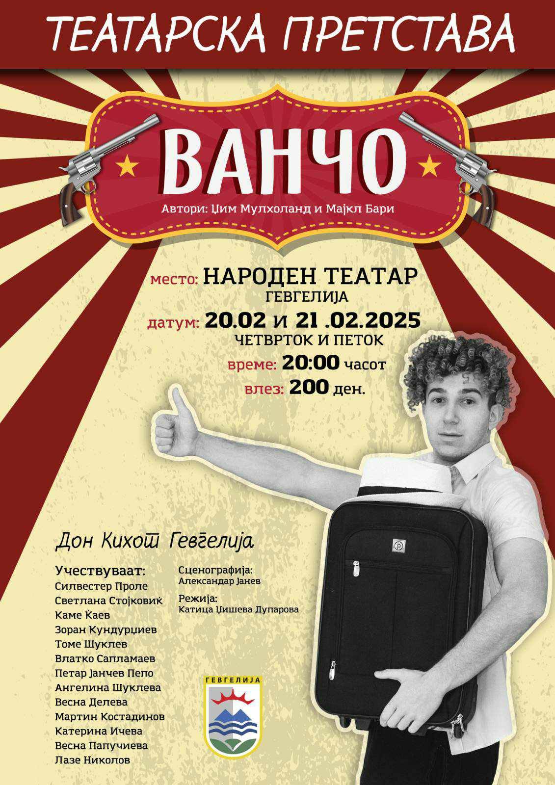 Гевгеличани ги очекува нова театарска претстава „Ванчо“ во изведба на Здружението на граѓани „Дон Кихот 95“- Гевгелија. Претставата ќе се одигра во два термина, премиерно- на 20 февруари (четврток) и втората изведба на 21 февруари 2025 година (петок), во Народниот театар- Гевгелија, со почеток во 20:00 часот. Влезот чини 200 денари. Влезниците се пуштени во продажба, а можат да се …