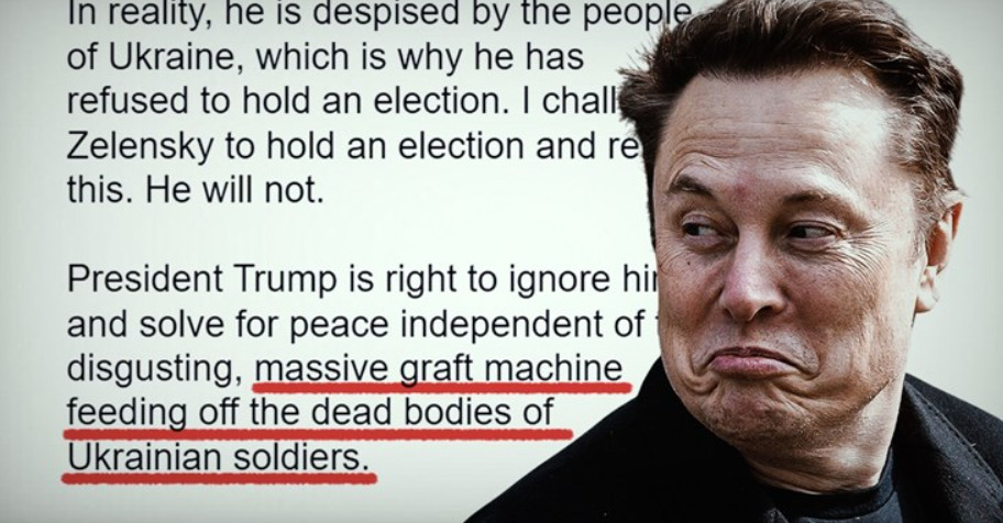 „Украинците го презираат Володимир Зеленски кој профитира од загинатите украински војници“, напиша Илон Маск на X. Маск ги повтори тврдењата на Трамп и го повика Зеленски „да ги одржи изборите и да престане со она што го прави сега“. „Ако украинскиот народ навистина го сака Зеленски, тогаш тој би одржал избори. Тој знае дека ќе загуби со голема разлика, …