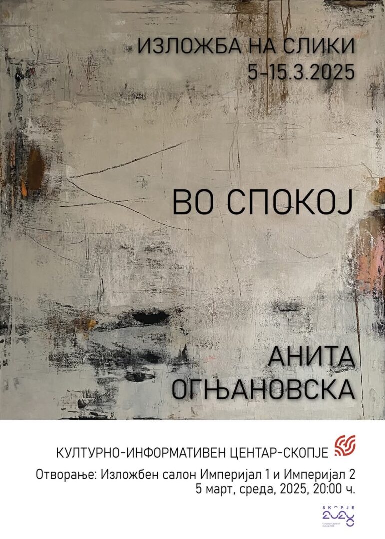 Изложбата насловена „Во спокој“ е деветта самостојна изложба на Анита Огњановска, чие отворање ќе се одржи на 5 март 2025 година, со почеток во 20:00 часот, во двата изложбени салони, Империјал 1 и Империјал 2, во Културно-информативниот центар (КИЦ) – Скопје. Огњановска повторно се претставува пред македонската публика со нов циклус дела кои истражуваат теми како личните емоции, секојдневните моменти …