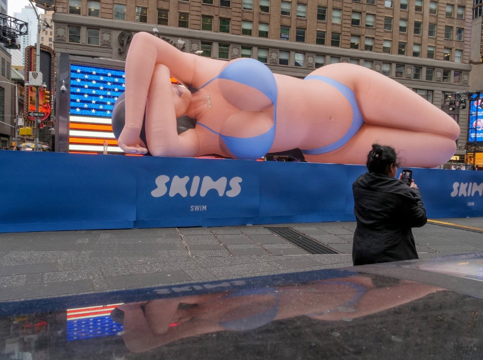 Ким Кардашијан предизвика многу реакции со својата нова кампања која ги промовира SKIMS, нејзината линија костими за капење и долна облека. Таа постави џиновска кукла на надувување во сино бикини на Тајмс Сквер во Њујорк. Инсталацијата е долга 18 метри, а поради нереалните пропорции на куклата која наликува на Ким, 44-годишната ријалити ѕвезда доби многу критики. „Нереален приказ на женското …