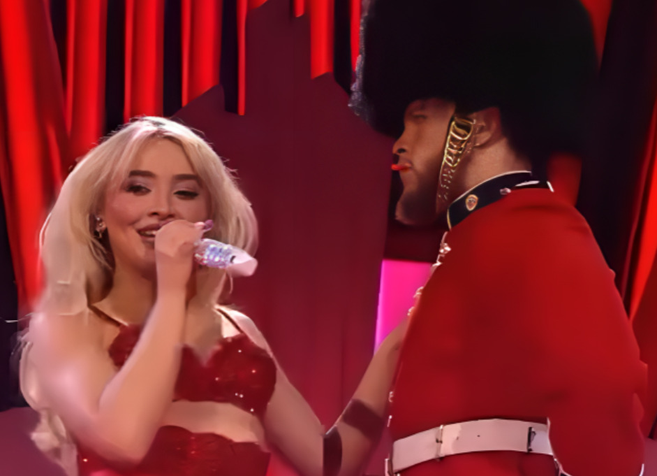 Сабрина Карпентер, една од најголемите светски поп ѕвезди, на доделувањето на наградите Брит настапи во нејзиниот препознатлив стил кој, се чини, беше премногу за Британците (или некои од нив). 25-годишната пејачка, позната по своите провокативни изданија и танцови потези, на сцената се појави во црвен корсет, опкружена со танчери облечени како членови на Кралската гарда. SABRINA CARPENTER 😭 pic.twitter.com/mAF72Kgjio — …
