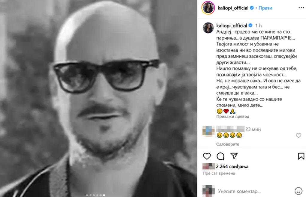 Популарната македонска пејачка Калиопи со потресни зборови се прости од Андреј Ѓорѓиески, член на бендот „ДНК“, кој трагично загина во пожарот во дискотека во Кочани. Пејачката се осврна на неговиот херојски чин, кога, според сведоштвата, Андреј се вратил во дискотеката за да ги спаси децата по катастрофалниот пожар кој брзо се проширил. View this post on Instagram A post shared …