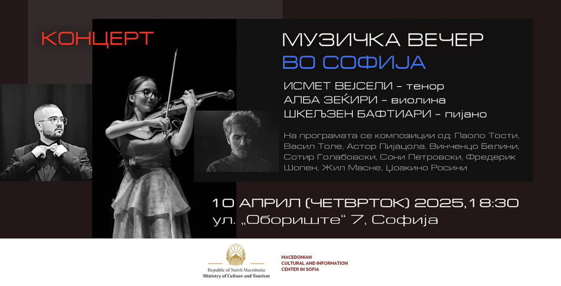 На 10 април 2025, со почеток од 18:30 часот, во Македонскиот КИЦ во Софија ќе се претстави музичкото трио во состав: Исмет Вејсели (вокал – тенор), Алба Зеќири (виолина) и Шкељзен Бафтиари (пијано). На програмата се композиции од: Паоло Тости, Васил Толе, Астор Пиjацола, Винченцо Белини, Сотир Голабовски, Сони Петровски, Фредерик Шопен, Жил Масне, Џоакино Росини. Исмет Вејсели е роден …