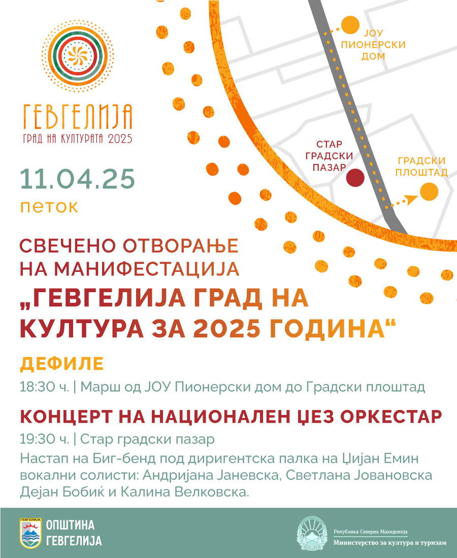Општина Гевгелија со Концерт на Националниот џез оркестар ќе го одбележи свеченото отворање на манифестацијата „Гевгелија град на културата за 2025 година“. На 11 април 2025 година, на Градскиот плоштад во Гевгелија, најпрво ќе биде одржано дефиле, во коешто ќе учествуваат на стотина дечиња вклучени во активностите од областа на културата што се реализираат во ЈОУ Пионерски дом „Јосип Броз …