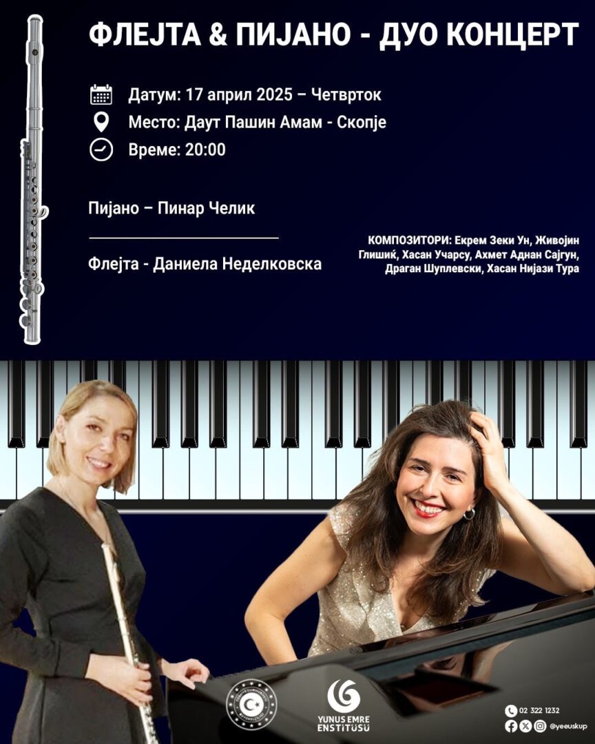 Овој четврток, со почеток во 20 часот, во Даут Пашиниот Амам – објект на Националната галерија на Северна Македонија, ќе се одржи концерт на интернационалното дуо составено од Даниела Неделковска (флејта, Северна Македонија) и Пинар Челик (пијано, Република Турција). Концертната програма опфаќа дела од македонски и турски автори, нудејќи музичко доживување кое ги спојува традициите, културата и естетиката на Балканот …