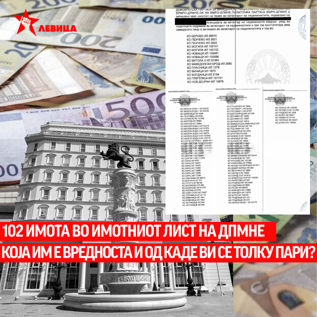 ВМРО-ДПМНЕ во својот имотен лист има запишано неверојатни 102 имота распоредени на атрактивни локации низ цела држава, велат од политичката партија Левица. „Кога ќе се погледнат добро 102-та имотни листа, во нив ќе се видат не само објекти, туку и шуми, ливади, пасишта, ниви!? Имајќи ја предвид нивната мегаломанска бела палата и сите овие 102 имота, ВМРО-ДПМНЕ е најбогатата политичка …