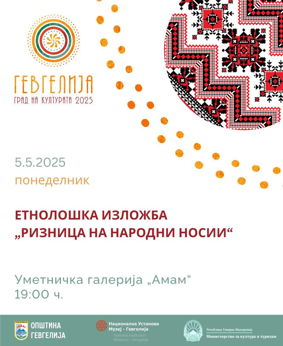 НУ Музеј- Гевгелија во соработка со Андреј Проданов организира етнолошка изложба „Ризница на народни носии“. Изложбата е дел од програмата за манифестацијата „Гевгелија град на култура 2025 година“ и ќе биде отворена на 5 мај 2025 година, во уметничката галерија „Амам“, со почеток во 19:00 часот. Поставката опфаќа изложување на 7 народни носии, коишто се колекција на Андреј Проданов, долгогодишен …