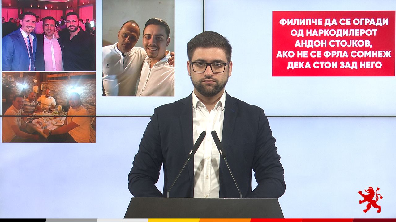 „24 часа Венко Филипче и СДС молчат за нивниот пријател и функционер Андон Стојков, кој беше фатен со дрога. Филипче и СДС молчат затоа што Андон Стојков е нивен близок пријател, а тоа се гледа од овие фотографии со Венко Филипче и Зоран Заев“, рече Валентин Манасиевски, член на ЦК на ВМРО-ДПМНЕ. „Срамота е на кое дереџе се спушти СДС …