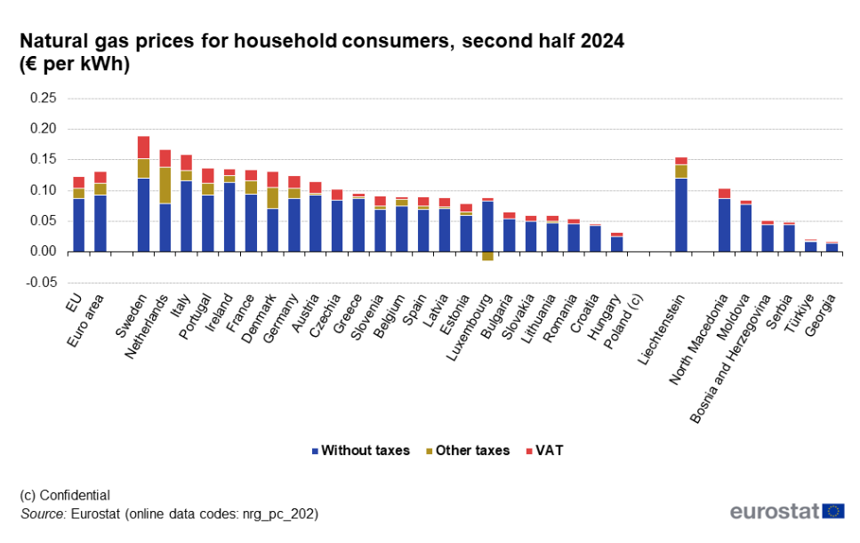 Домаќинствата во Европската Унија плаќале највисока цена на гас во втората половина од 2024 година откако Европскиот завод за статистика објавува податоци. Просечната цена на гасот за домаќинствата во ЕУ беше за речиси 11,7 проценти повисока во втората половина од 2024 година отколку во претходните шест месеци, достигнувајќи го највисокото ниво од 2008 година, од 12,33 евра за 100 киловат-часови. …