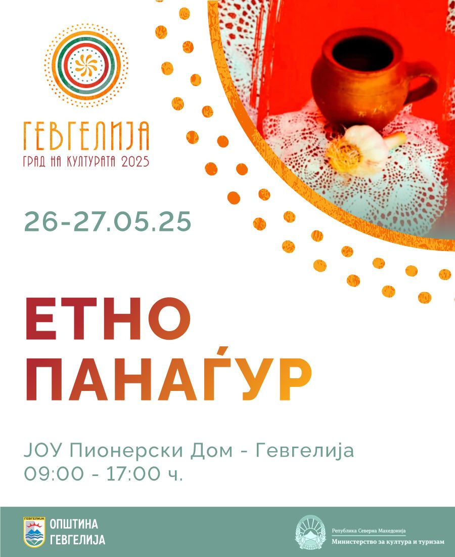 На 26 и 27 мај 2025 година, ЈОУ Пионерски дом „Јосип Броз Тито“- Гевгелија, во рамки на манифестацијата „Гевгелија град на култура за 2025 година“, организира уникатен културен настан „Етно панаѓур“. Холот на Пионерскиот дом ќе биде трансформиран во автентичен изложбен салон, каде што посетителите ќе можат да уживаат во богатата поставка, но и да си купат рачно изработени грнчарски …