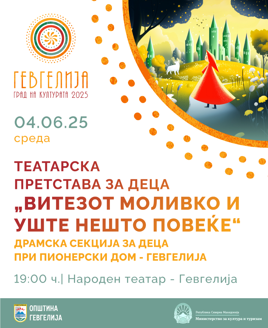 На 4 јуни 2025 година, дечињата од Драмската секција ќе ја прослават својата успешна учебна година со премиерна изведба на театарската претстава за деца „Витезот Моливко и нешто повеќе“, во продукција на ЈОУ Пионерски дом „Јосип Броз Тито“- Гевгелија. Премиерата ќе се одигра во Народниот театар- Гевгелија, со почеток во 19:00 часот. Влезот е слободен. Станува збор за сценарио адаптирано …