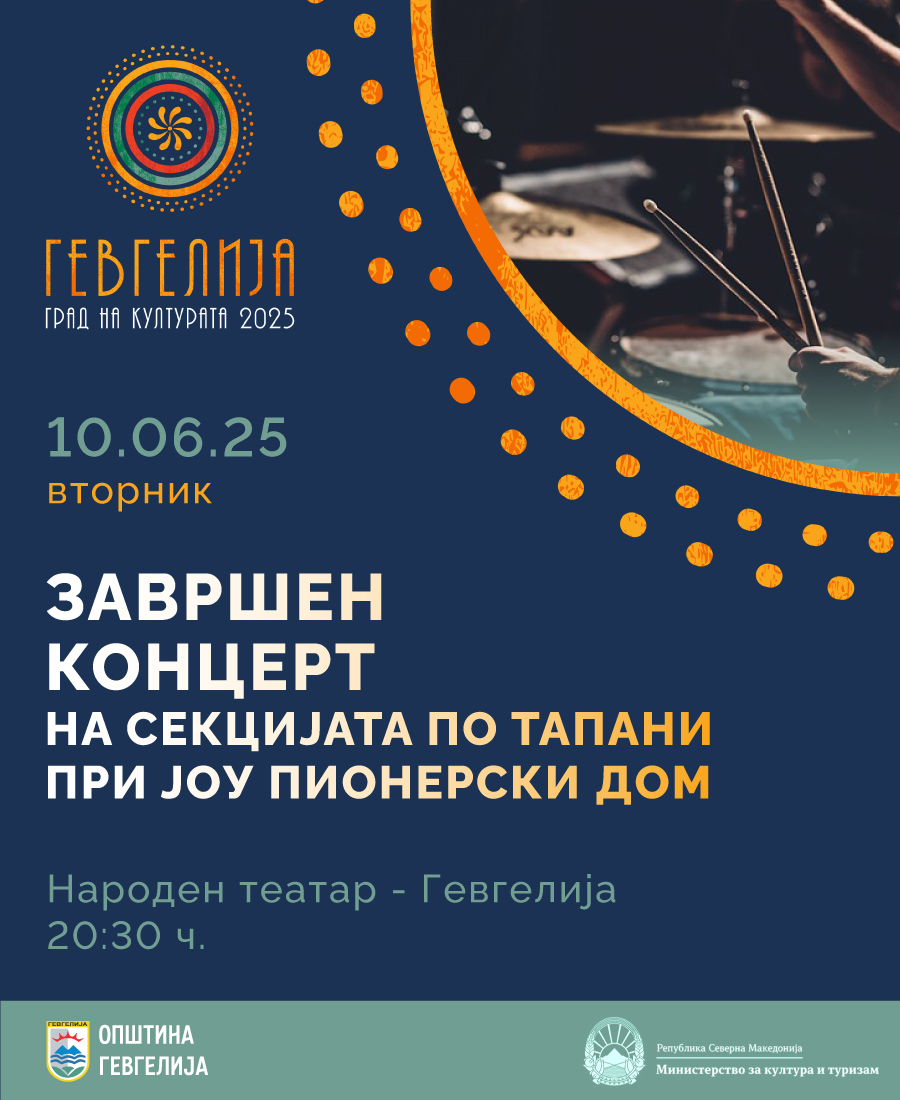 На 10 јуни 2025 година, со почеток во 20:30 часот, на платото пред Народниот театар во Гевгелија, ќе се одржи Завршниот концерт на Секцијата по тапани, којашто функционира во рамки на културните активности на ЈОУ Пионерски дом „Јосип Броз Тито“- Гевгелија. Секцијата работи под менторство на музичкиот педагог и тапанар Момчило Делев, а на концертот публиката ќе има можност да …