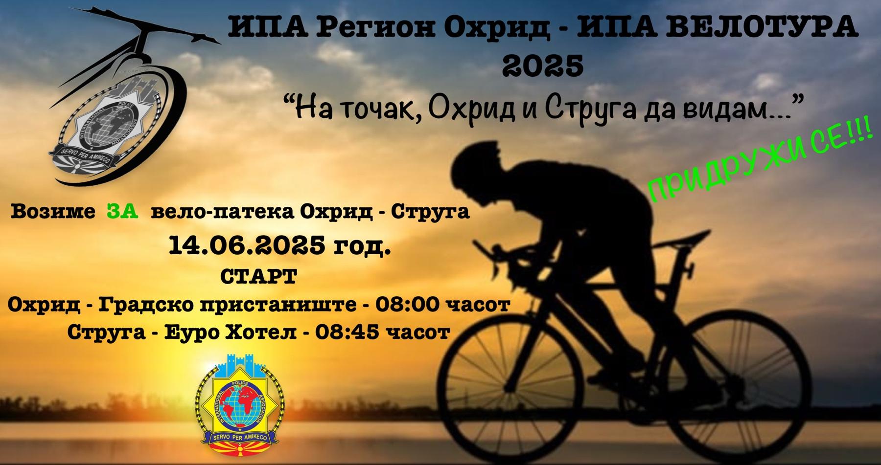 Во организација на Интернационалната полициска асоцијација (ИПА) Охрид, утре 13 јуни, започнува Ипа вело викендот „НА ТОЧАК, ОХРИД И СТРУГА ДА ВИДАМ“ во чии рамки, во сабота (14 јуни), ќе се одржи рекреативна велосипедска тура Охрид-Струга-Радожда. Овој спортски настан, се одржува по деветти пат а главната цел е актуелизирање на ИПА иницијативата за велосипедско поврзување на двата крајезерски града-Охрид и …
