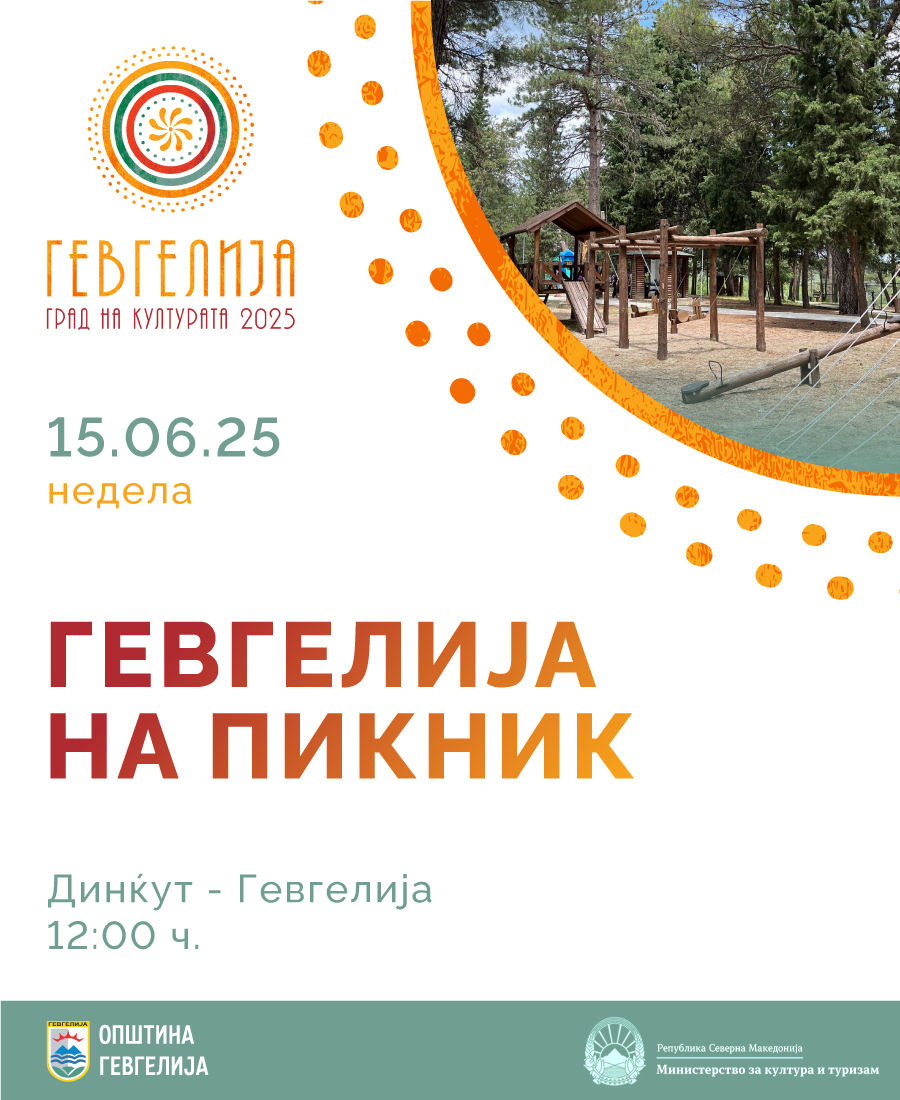 Во рамки на програмата за „Гевгелија град на култура за 2025 година“, Здружението на граѓани „АРТ УМ 023“ организира рекреативно-забавен настан под наслов „Гевгелија на пикник“. Настанот кој ќе се одржи на 15 јуни 2025 година (недела), на локалитетот „Динќут во Гевгелија, со почеток во 12:00 часот, е замислен како дружење на отворено, во природа, со богата програма која вклучува …