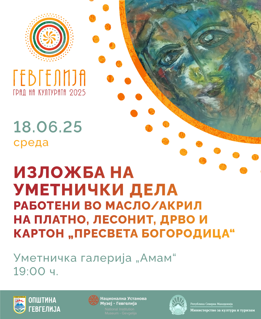 На 18 јуни 2025 година (среда), со почеток во 19:00 часот, во Уметничката галерија „Амам“- Гевгелија, ќе биде отворена изложбата на уметнички дела од Анета Таневска со наслов „Пресвета Богородица“. Изложбата претставува ликовна посвета инспирирана од духовниот и симболички лик на Богородица, како вечна инспирација за генерации уметници. Делата се изработени во различни техники и медиуми – масло и акрил …