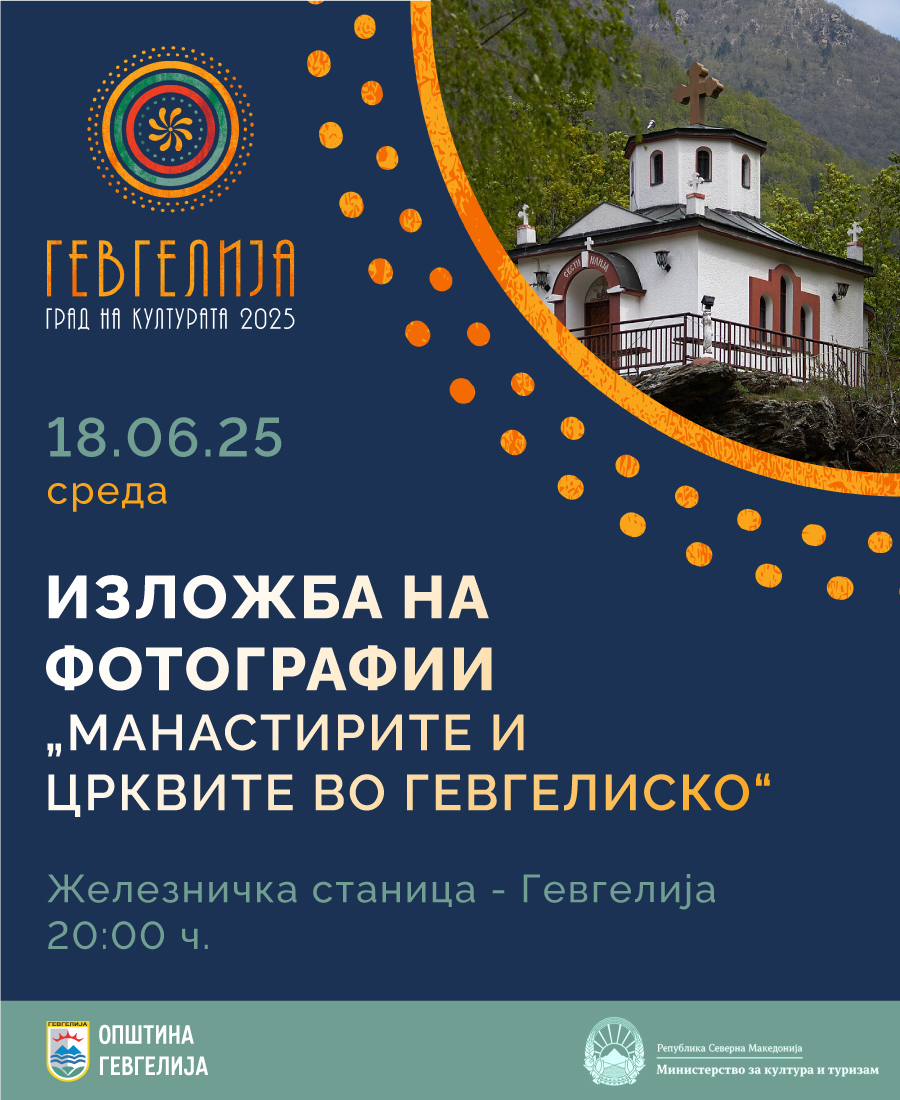 На 18 јуни 2025 година (среда), со почеток во 20:00 часот, на перонот на Железничката станица во Гевгелија, ќе биде отворена Изложбата на фотографии „Црквите и манастирите во Гевгелиско“. Изложбата се реализира во организација на Етнокореолошкиот оддел при ЈОУ Дом на култура „Македонија- Гевгелија, во рамки на манифестацијата „Гевгелија град на култура за 2025 година“. Овој проект претставува симбиоза на …