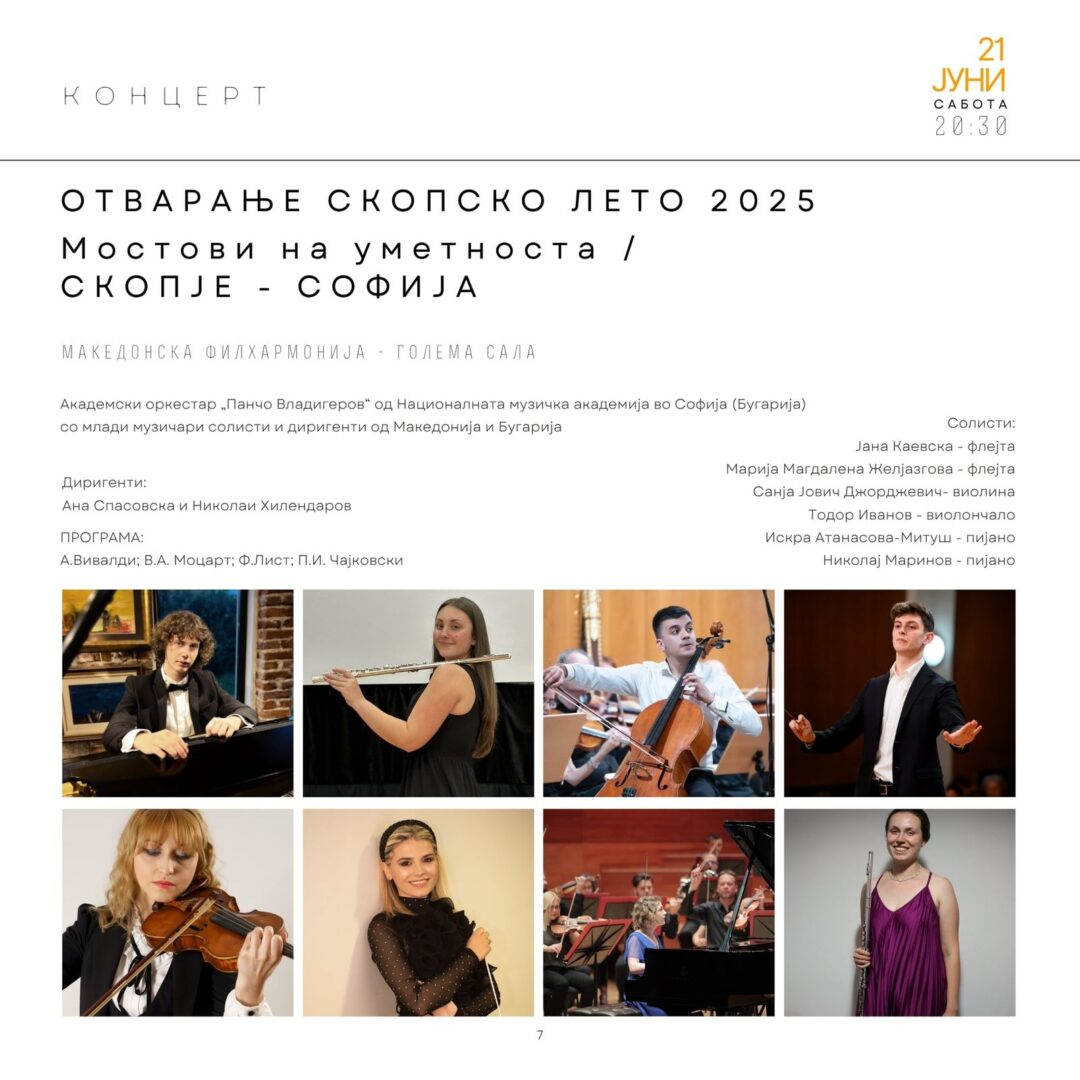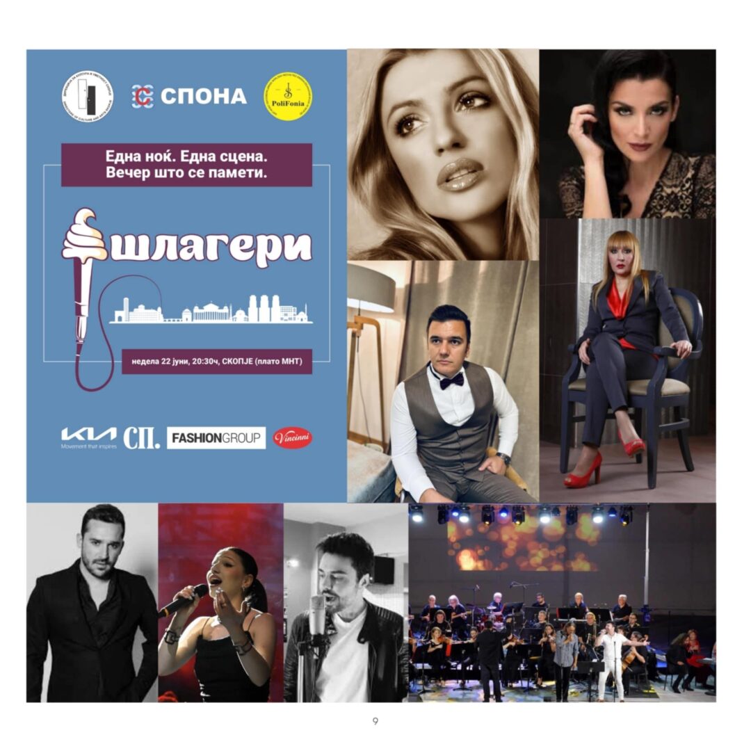 На 22 јуни, недела, во рамки на 46. издание на фестивалот „Скопско лето“ ќе се одржи концерт „Вечер на шлагери“ – 20 години СПОНА, со почеток во 20:30 часот на Платото пред Македонскиот народен театар. Диригент ќе биде Иван Еминовиќ, а водител на настанот Вера Јанковиќ. На сцената ќе настапат Оркестарот на „Полифонија“, а изведувачи се Денис Димоски, Оливер Њего, …