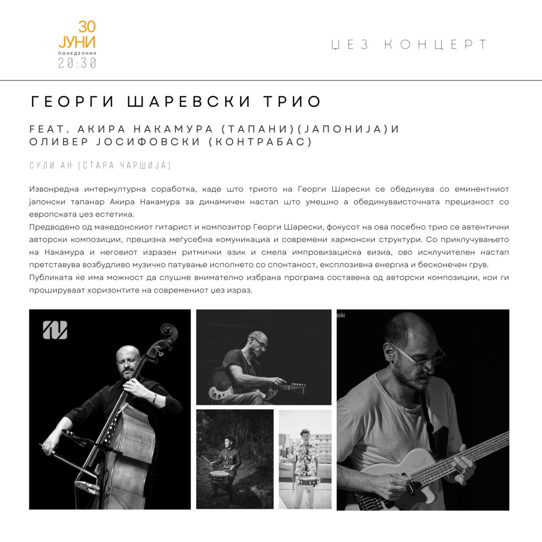 Во рамки на програмата на Скопско лето на 30 јуни (понеделник) во 20:30 часот во Сули ан (Стара Чаршија) ќе се одржи концерт на Георги Шарески Трио. Организаторите велат дека овој концерт претставува извонредна интеркултурна музичка соработка, каде што триото на македонскиот гитарист и композитор Георги Шарески се обединува со врвниот јапонски тапанар Акира Накамура, како и со истакнатиот контрабасист …