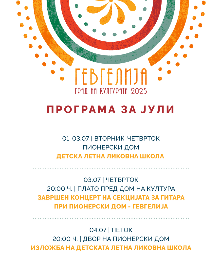 1 – 3 јули / вторник – четврток / Пионерски дом Детска летна ликовна школа 3 јули / четврток / Плато пред Народен театар/ 20:00 ч. Завршен концерт на Секцијата за гитара при Пионерски дом- Гевгелија 4 јули / петок / Двор на Пионерски дом / 20:00 ч. Изложба на Детската летна ликовна школа Уметничка галерија „Амам“/ 20:30 ч. Eтнолошка …