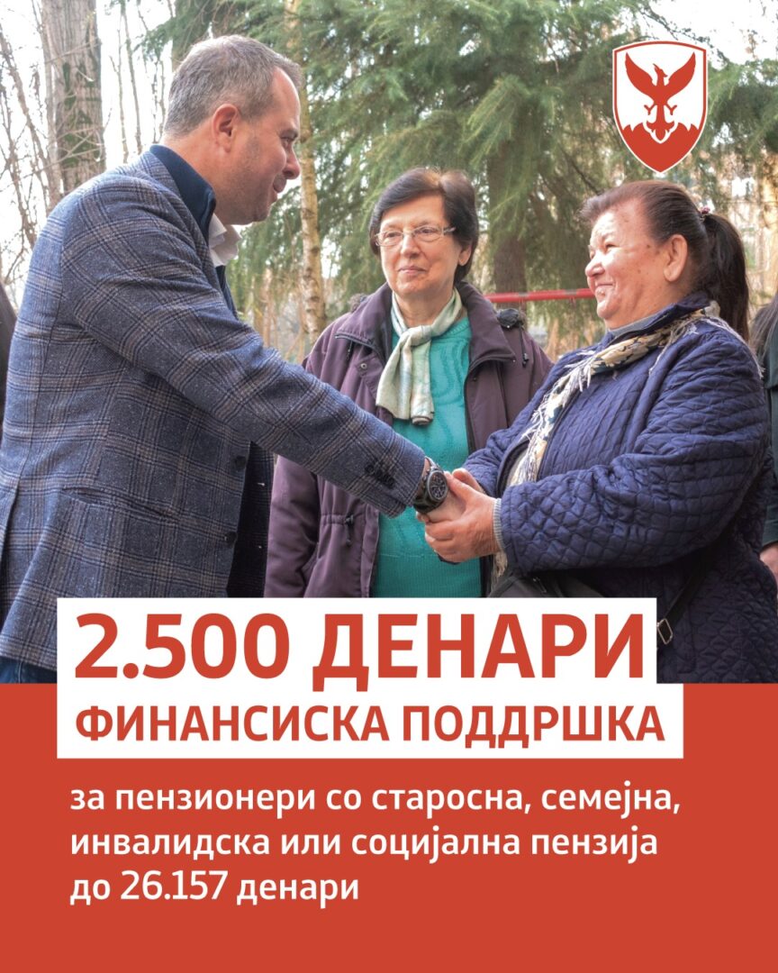 2.500 денари еднократна помош за пензионери со примања до 26.157 денари, најави Герасимовски