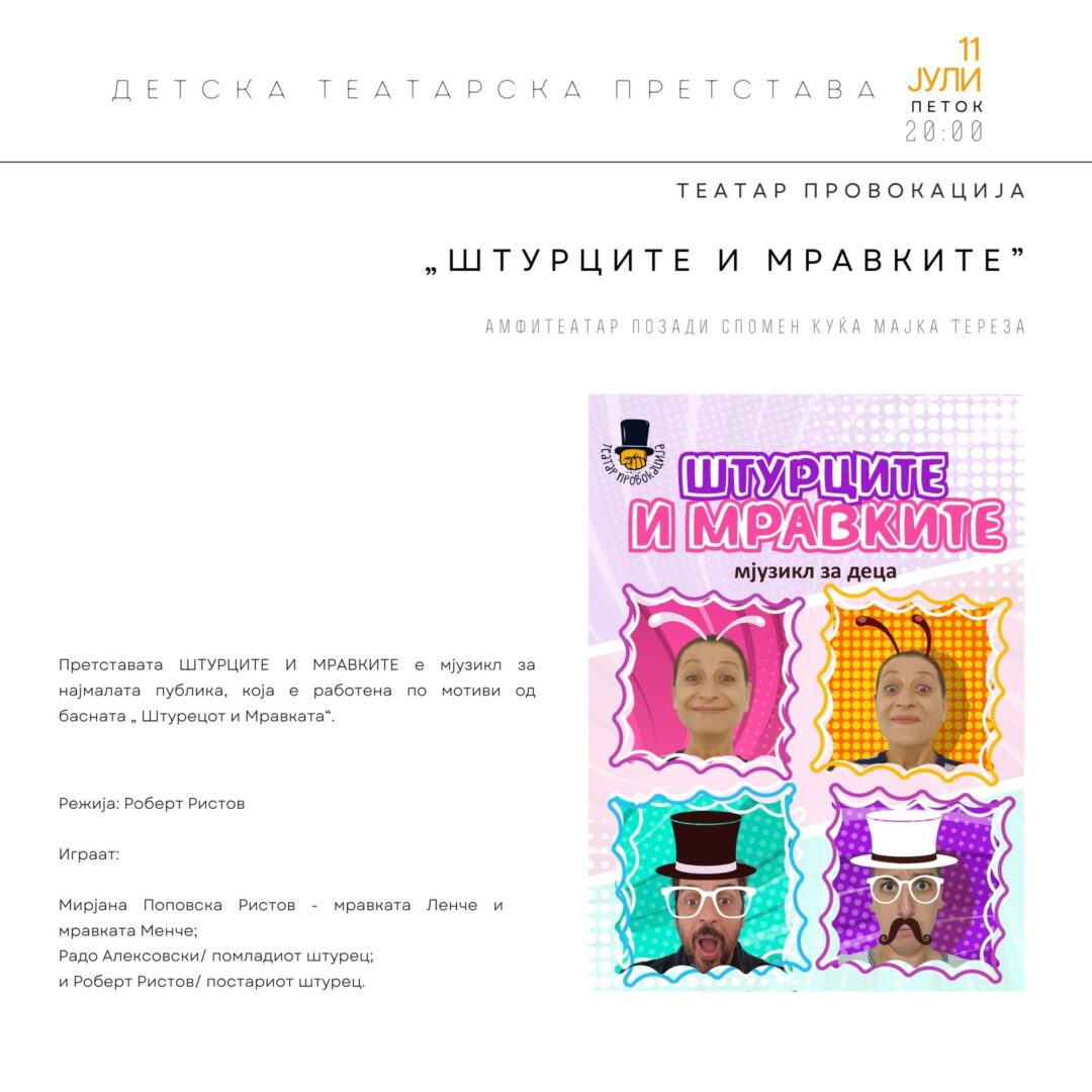 Вечерашниот концерт „Четири раце“ на Димчо Величков (Бугарија) и Мариана Ковал (Украина), кој требаше да се одржи во Музејот на македонската борба за самостојност во 20:30ч, се откажува, поради лоши временски услови кои попречија во патувањето на овие меѓународно познати и признати уметници. Програмата на 46. „Скопско лето“ продолжува утре вечер – 10.07.2025г. (четврток) со концерт на Алтус НЗ Ансамблот …