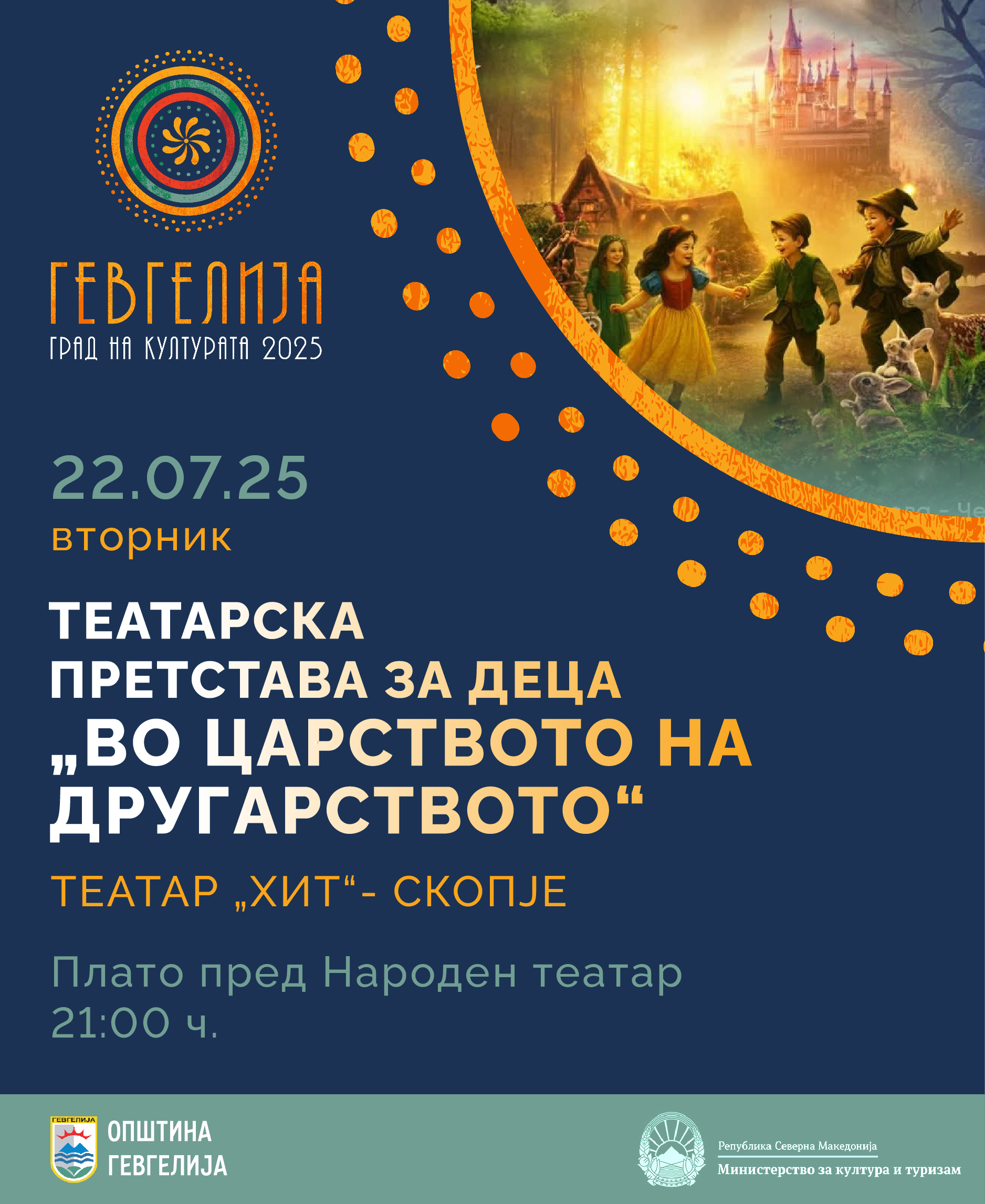 Во рамки на манифестацијата „Гевгелија град на културата за 2025“, на 22 јули 2025 година (вторник), со почеток во 21:00 часот, на платото пред Народниот театар во Гевгелија, ќе се одржи театарска претстава за деца со наслов „Во царството на другарството“, во изведба на Театар „Хит“- Скопје. Претставата претставува сказновито, едукативно и забавно сценско доживување, кое преку хумор и фантазија …