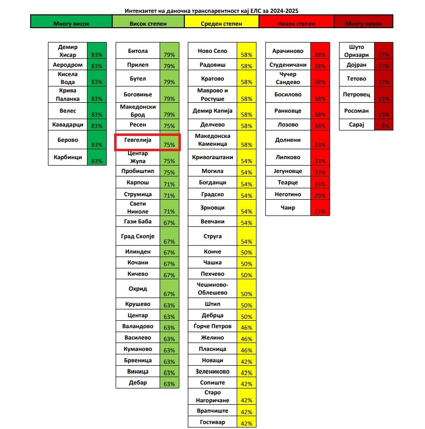Општина Гевгелија е една од 11 општини во Република Македонија кои влегуваат во групата на најтранспарентни единици на локална самоуправа, со освоени максимални 16 поени за буџетска транспарентност. Ова е нотирано во Извештајот за фискална транспарентност на општините- Буџетска и даночна транспарентност за периодот 2024-2025 година, изготвен од Центарот за економски анализи (ЦЕА). Според резултатите, Општина Гевгелија го зазема првото …