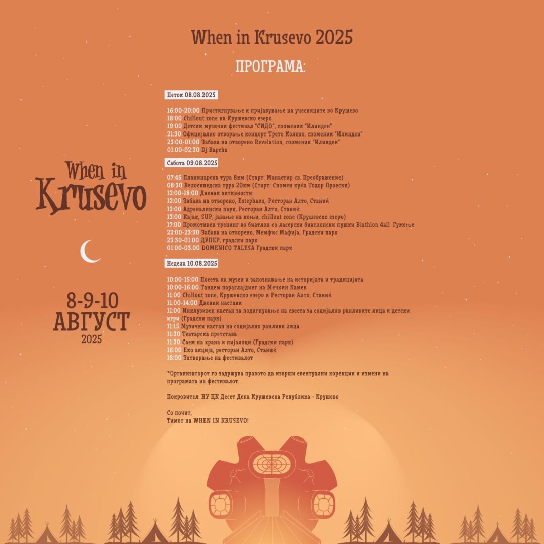 Овогодинешното издание на фестивалот на отворено When in Krusevo 2025 почнува во петок, 08 август. Во 18 ч. се отвора т.н. chill out зона на Крушевско Езеро, а во 19 часот ќе започне детскиот музички фестивал „СИДО“ пред споменикот Илинден (Македониум). Од 21:30 започнуваат концертите на Трето Колено, Revelation и ди џеј Бапчу, исто така пред споменикот Македониум. Во сабота ќе …