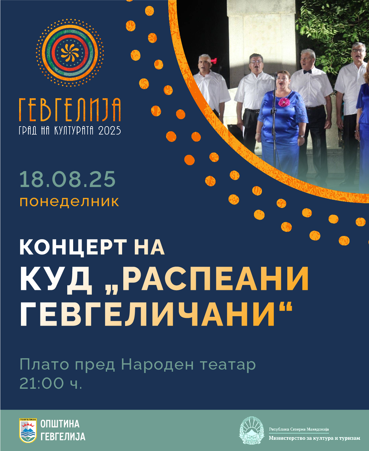 Програмата за август, во рамки на манифестацијата „Гевгелија град на култура за 2025 година“, продолжува со Концерт на староградска песна и музика на Културно-уметничкото друштво „Распеани гевгеличани“, кој ќе се одржи денес (18 август 2025 година), со почеток во 21:00 часот, на платото пред Народен театар- Гевгелија. Членовите на Друштвото ќе ги изведат најубавите староградски песни и мелодии, пренесувајќи ја …