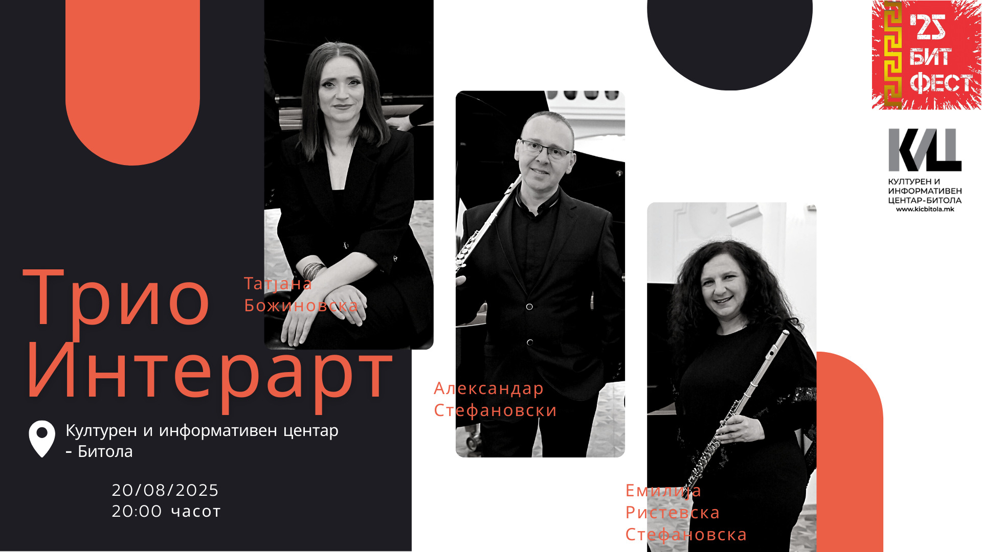 Битолското културно лето „БИТ ФЕСТ“, вечерва со прекрасна програма за битолската публика. Љубителите на класичната музика ќе имаат ретка можност да уживаат во извонреден концерт на триото „Интерарт“, составено од уметниците: Емилија Ристевска Стефановска (флејта), Александар Стефановски (флејта) и Татјана Божиновска (пијано). Прекрасната вечер на класичен сјај и виртуозност ќе го исполни Офицерскиот дом со почеток од 20 часот и …