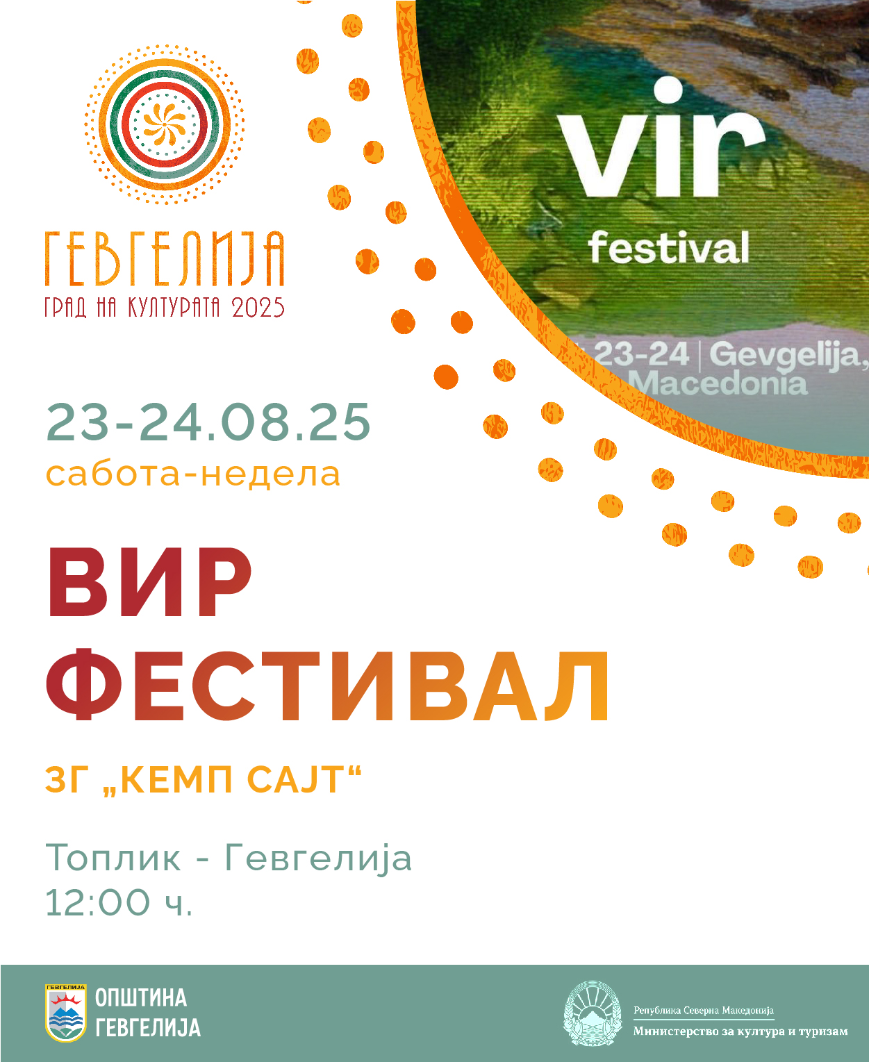 На 23 и 24 август 2025 година, во месноста „Топлик“- Гевгелија, ќе се одржи Вир Фестивал, дводневен музички и уметнички настан во организација на ЗГ „Кемп Сајт“- Гевгелија. Овој фестивал што се реализира во рамки на програмата за „Гевгелија град на културата 2025“, е поддржан од Општина Гевгелија и е замислен како уникатна културна манифестација што ја обединува музиката, уметноста …