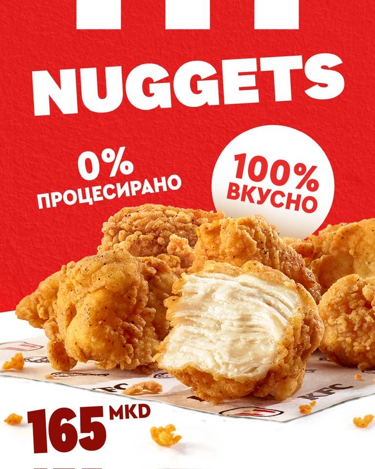Храната во KFC ги надминува очекувањата дури и на оние најпребирливите. Во менито може да ги најдете новите пилешки KFC NUGGETS, кои навистина вреди да се пробаат. Крцкави однадвор, а внатре меки, со навистина прекрасен вкус за љубителите на пилешко месо. Направени од 100% чисто пилешко месо кое не е процесирано, кое ги има поминато сите сертифицирани контроли за здрава …