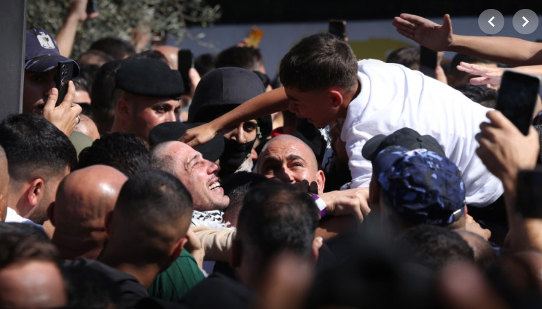 Палестинските затвореници беа пречекани со ентузијазам во Рамала, на окупираниот Западен Брег, денес по нивното ослободување од израелските затвори. Некои покажуваа знаци на победа со рацете, а повеќето со насмевки на лицата излегоа од автобусот што ги однесе од израелски затвор до културниот центар во градот каде што е седиштето на Палестинската самоуправа. NOW: Buses carrying Palestinian prisoners arrive in …