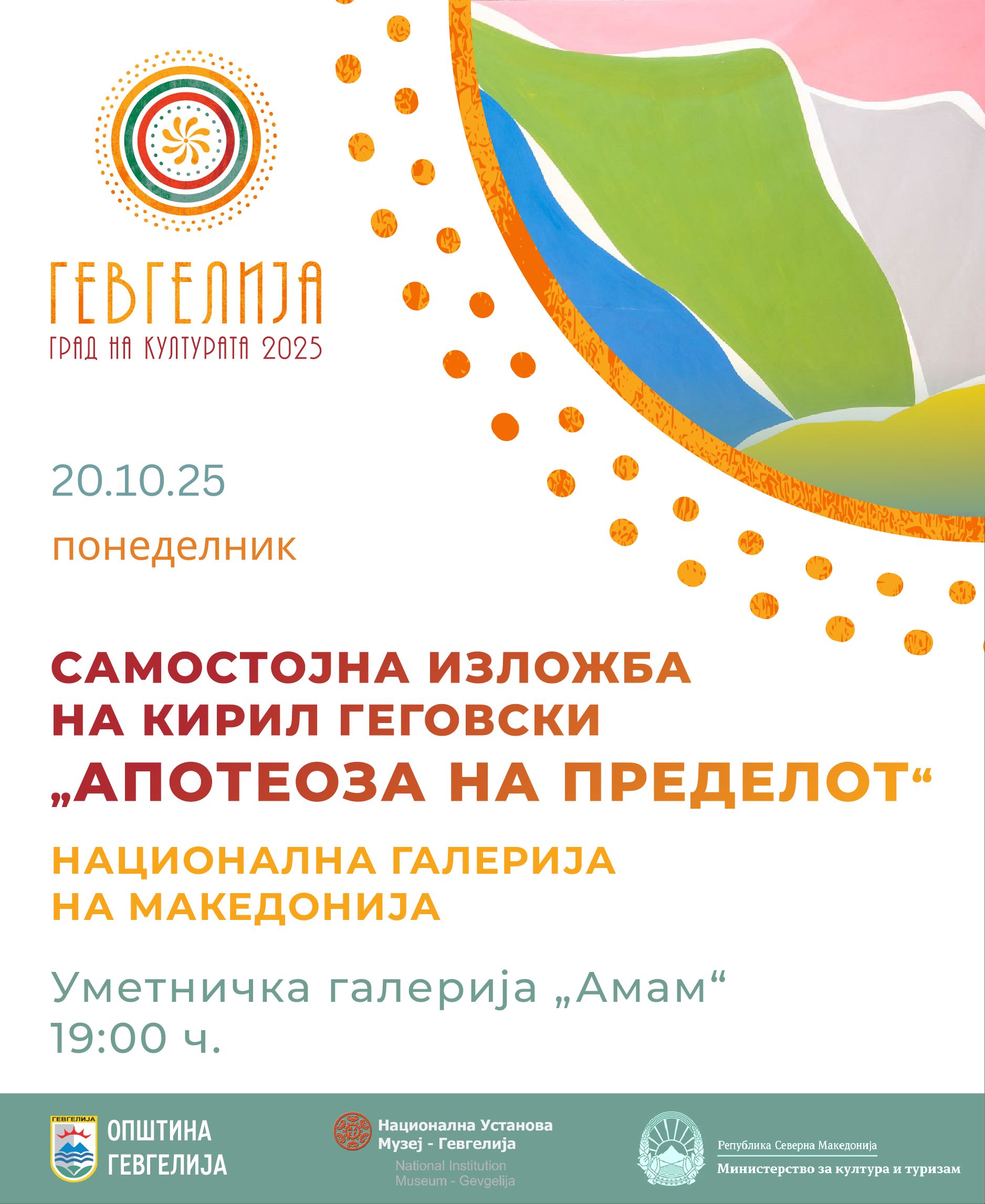 Во рамките на програмата за „Гевгелија град на културата за 2025 година“, на 20 октомври (понеделник), со почеток во 19:00 часот, во Уметничката галерија „Амам“ ќе биде отворена самостојна Изложба на реномираниот ликовен уметник Кирил Гегоски, насловена „Апотеоза на пределот“, во организација на ЈОУ Дом на култура „Македонија“- Гевгелија во соработка со НУ Национална галерија на Македонија и НУ Музеј- …