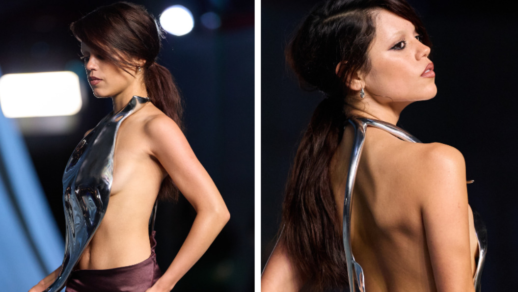 Џена Ортега на црвениот тепих во метален топ со гол грб