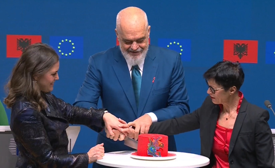 Албанија со торта во Брисел го прослави отворањето на последниот преговарачки кластер со ЕУ