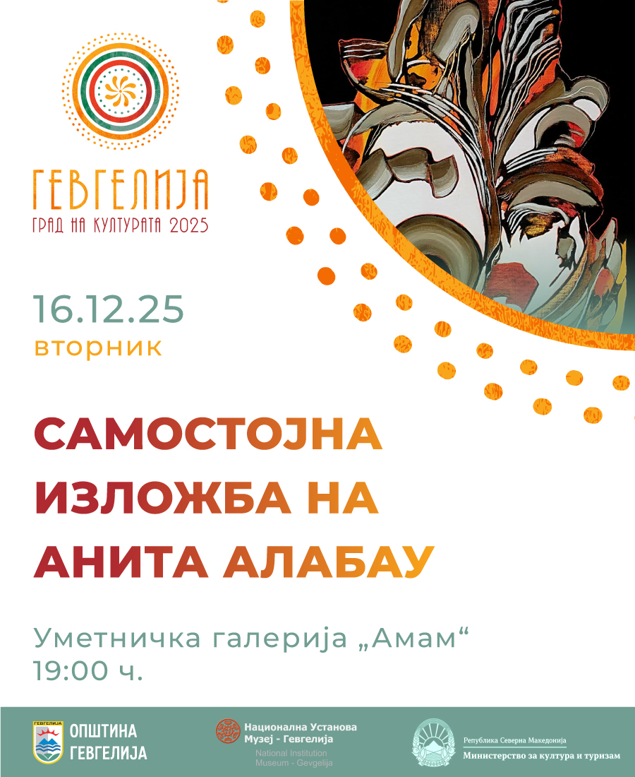 На 16 декември 2025 година (вторник), во Уметничката галерија „Амам“ во Гевгелија, со почеток во 19:00 часот, ќе биде отворена самостојната изложба на Анита Алабау, насловена „Хроматско патување“. Изложбата се реализира во организација на ЈОУ Дом на култура „Македонија“- Гевгелија и соработка со НУ Музеј- Гевгелија, во рамките на програмата „Гевгелија град на културата за 2025 година“. Во рамките на …