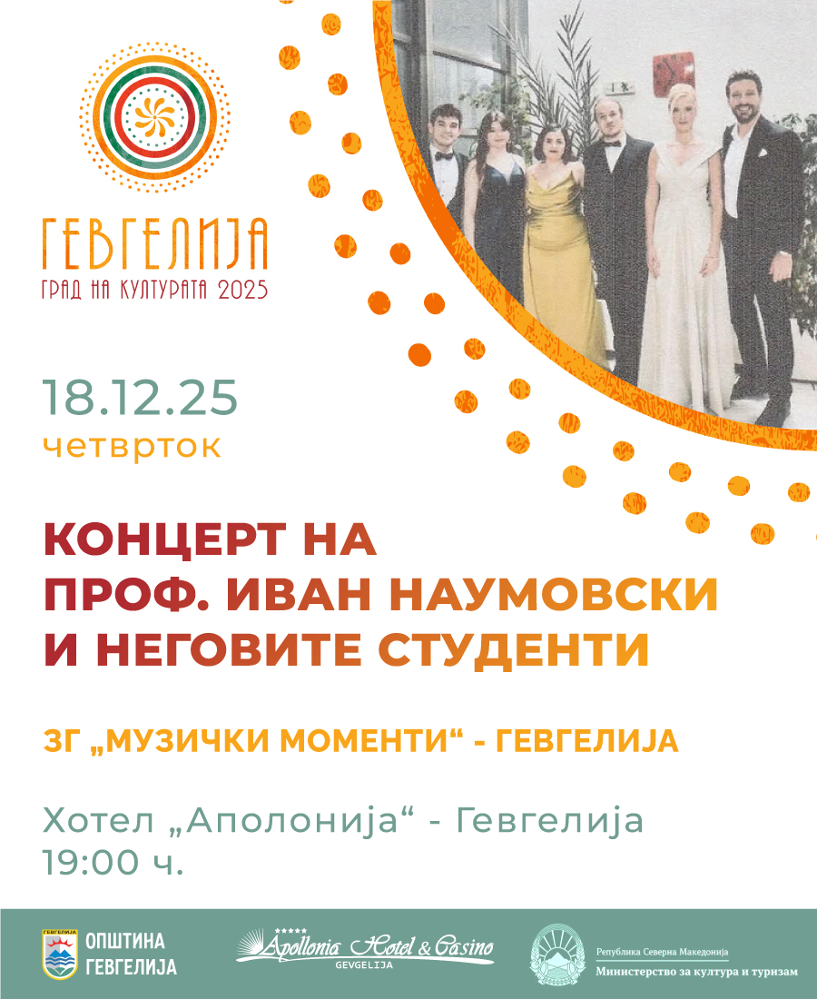 Во рамките на манифестацијата „Гевгелија град на културата за 2025 година“, вечерва (18 декември 2025 година), во хотелот „Аполонија“- Гевгелија, со почеток во 19:00 часот, ќе се одржи Концерт на проф. Иван Наумовски и неговите студенти, во организација на ЗГ „Музички моменти“- Гевгелија по повод одбележувањето на 25-годишната музичка дејност на Здружението. Концертната вечер ќе биде посветена на вокално-уметничкиот израз …