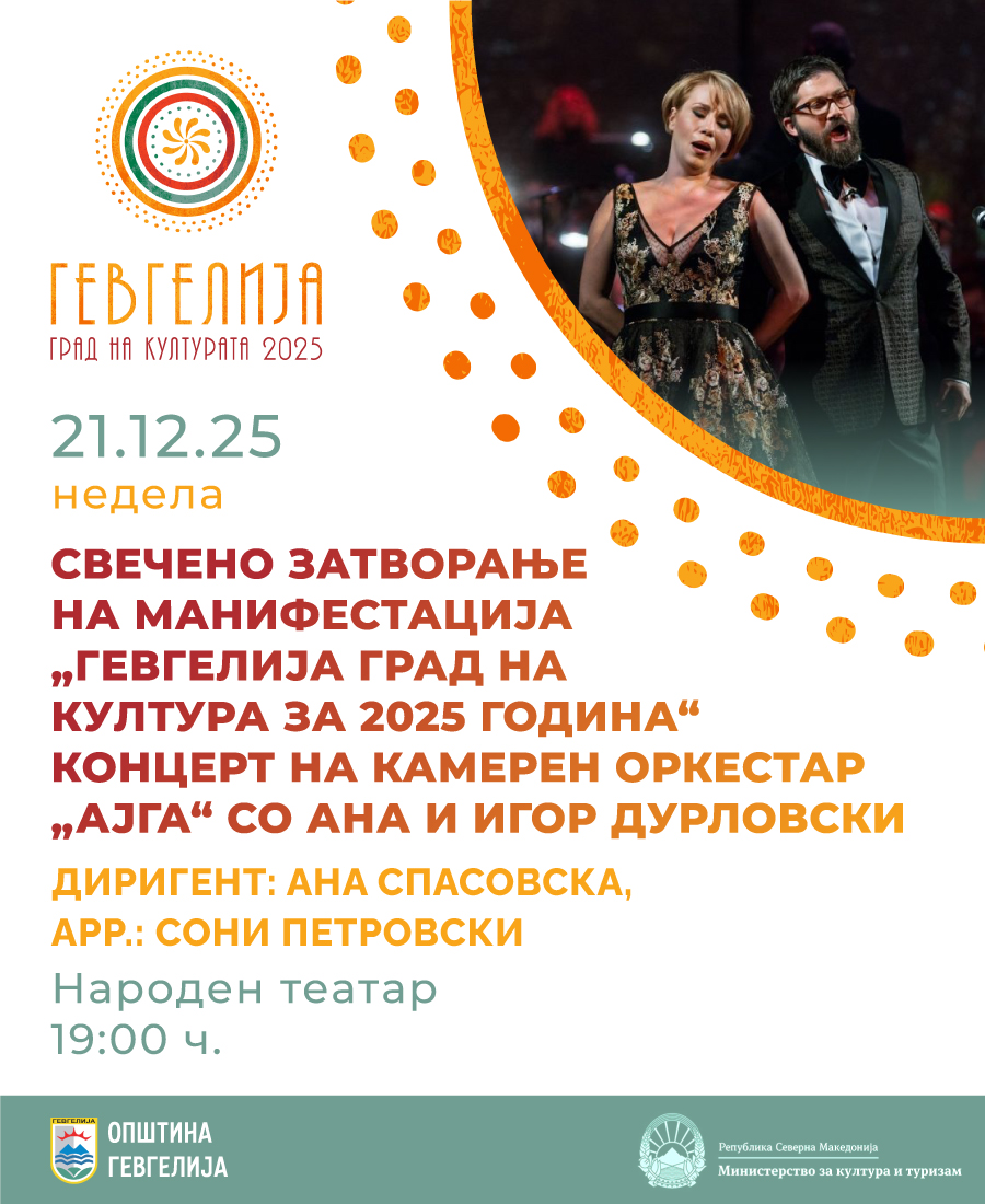 21 декември: Свечено затворање на „Гевгелија град на култура за 2025 година“ со концерт на Камерниот оркестар „Ајга“ и Ана и Игор Дурловски – музичко патување низ македонската традиција