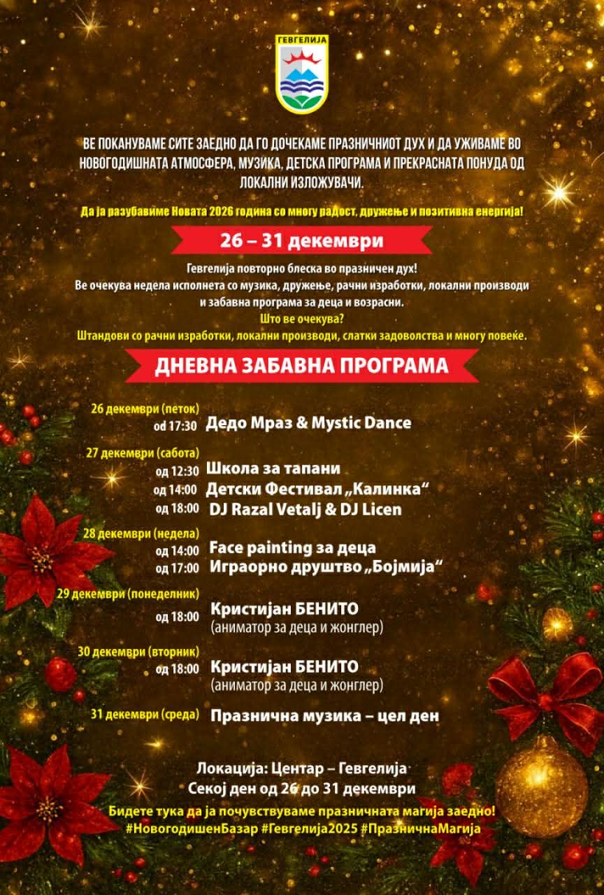Со свечена празнична атмосфера, музика и богата содржина, од денес (26 декември), на Градскиот плоштад во Гевгелија започнува Новогодишниот базар, кој ќе трае до 31 декември 2025 година. Настанот во организација на Општина Гевгелија, кој веќе традиционално го обединува празничниот дух, дружењето и локалната креативност, нуди разновидна програма наменета за сите генерации. Новогодишниот базар ќе се одвива во знакот на …